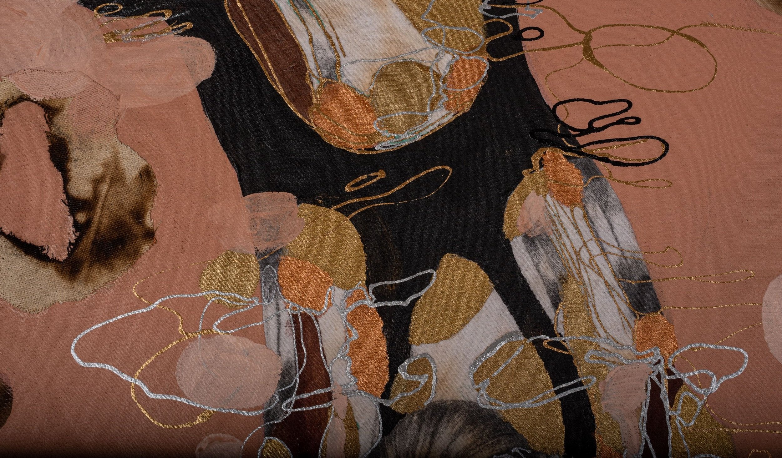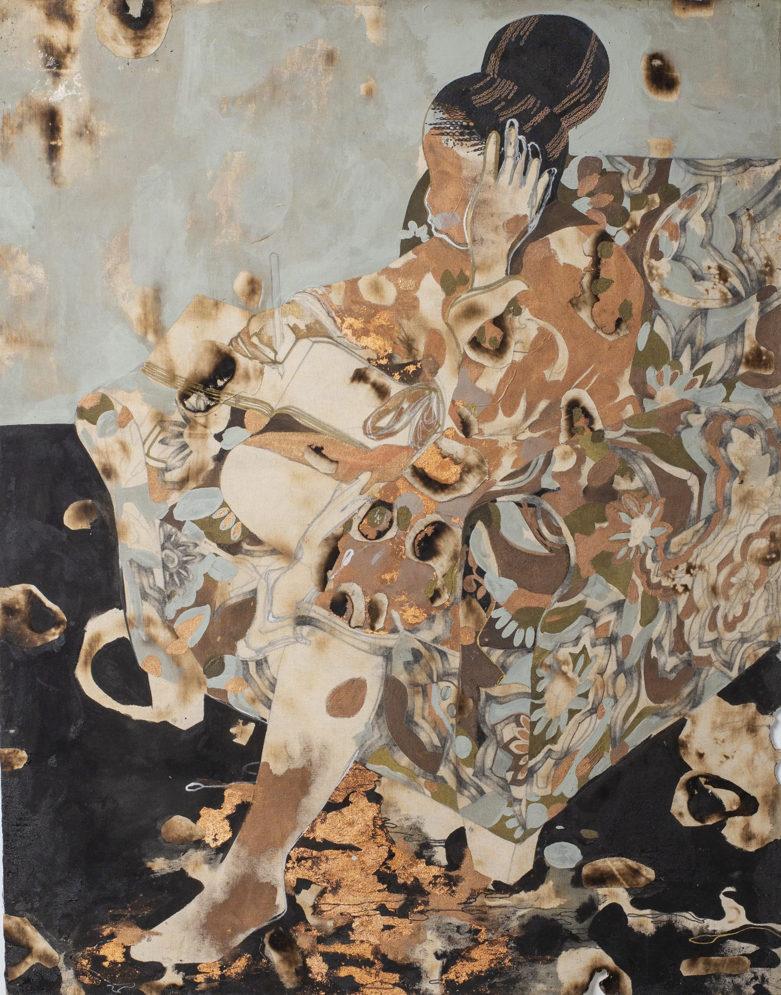 Acrylic, graphite, ink, and metal leaf on burned canvas