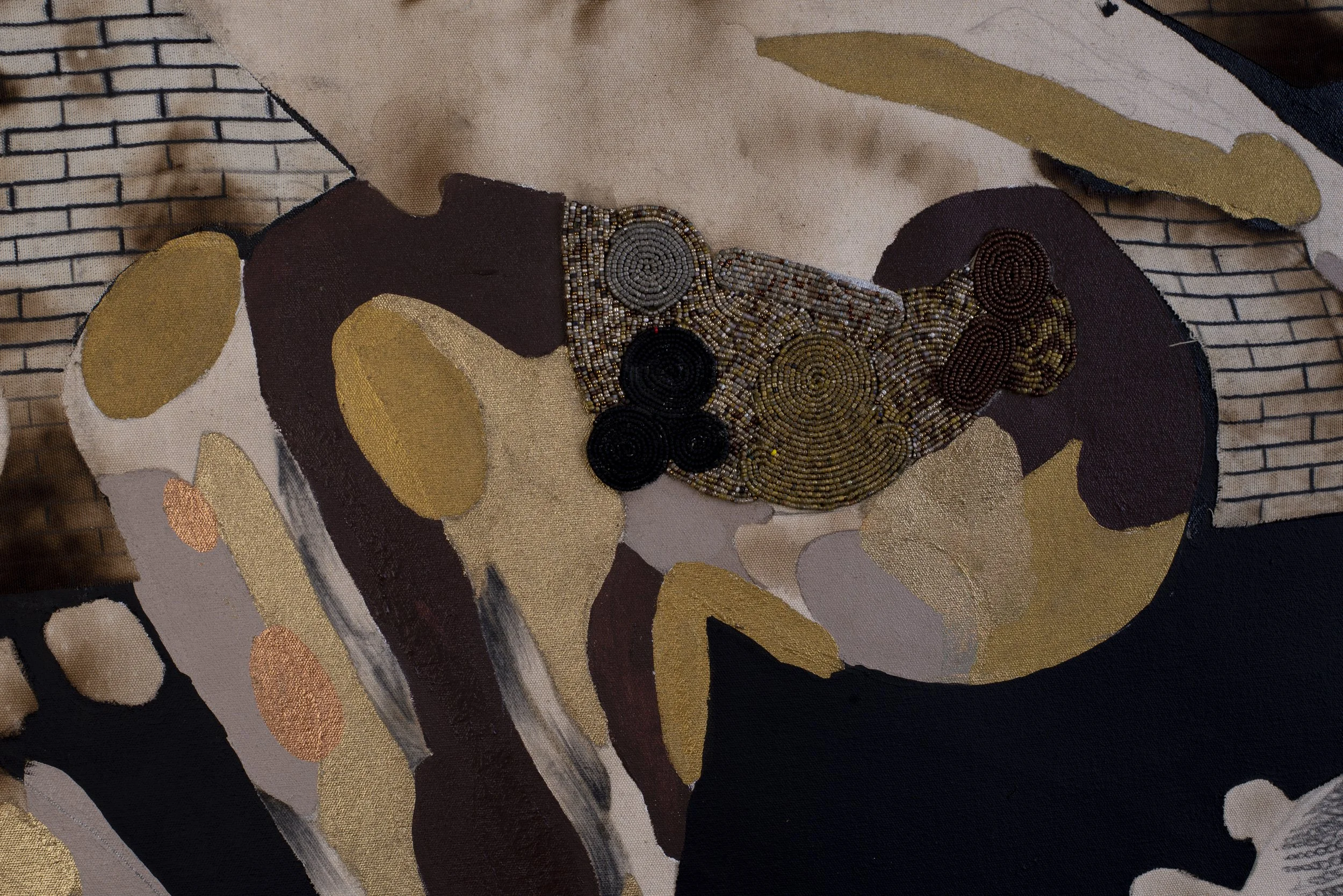 Acrylic, graphite, ink, and beads on burned canvas
